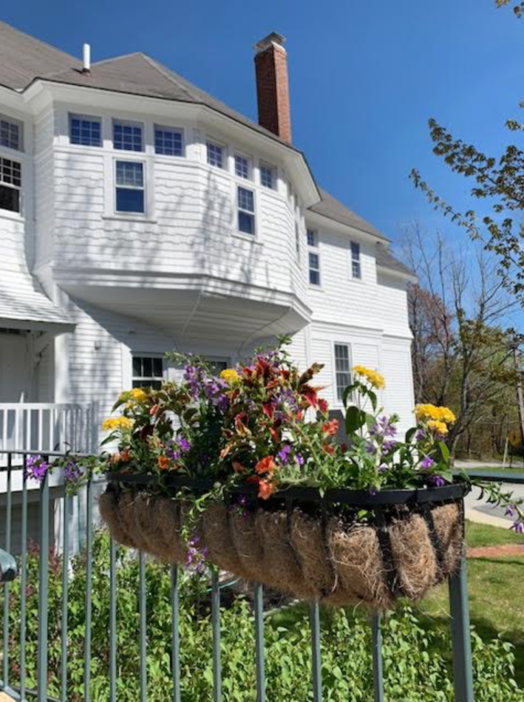 In 2020, cheery colors were selected: reds, yellow, purples. Plants for the hayracks include purple Angelonia, Lantana “Bananarama”, Coleus, red/orange Calibrachoa, and purple Scaevola. The urns have Illumination Golden Picotee Begonias, Torenia and variegated Vinca. My intention was to add loads of Creeping Jenny dripping down the sides of the urns, but I could find it nowhere. I’ve discovered that some states have begun classifying it as ‘invasive’, so most greenhouses have ceased growing it.